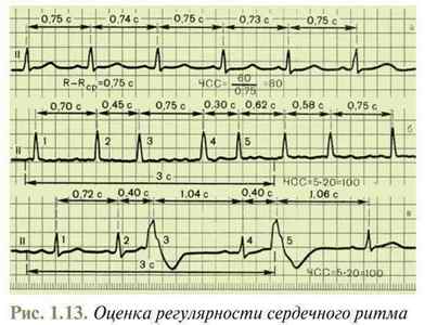 Рис. 1.13. Оценка регулярности сердечного ритма Гораздо удобнее определять ЧСС с помощью специальных таблиц, в которых каждому значению интервала R–R соответствует показатель ЧСС.При неправильном ритме ЭКГ в одном из отведений (наиболее часто во II стандартном) записывается дольше, чем обычно, например в течение 3–4 с.При скорости движения бумаги 50 мм·с -1 это время соответствует отрезку кривой ЭКГ длиной 15–20 см. Затем подсчитывают количество комплексов QRS, за регистрированных за 3 с (15 см бумажной ленты), и полученный результат умножают на 20.При неправильном ритме можно ограничиться также определением минимальной и максимальной ЧСС. Минимальная ЧСС определяется по продолжительности наибольшего интервала R–R, а максимальная ЧСС — по наименьшему интервалу R–R.У здорового человека в состоянии покоя ЧСС составляет от 60–90 уд./мин. Повышение ЧСС (более 90 уд./мин) называют тахикардией, а снижение (менее 60 уд./мин) — брадикардией.О.С. Сычев, Н.К. Фуркало, Т.В. Гетьман, С.И. Деяк \»Основы элекрокардиографии\»