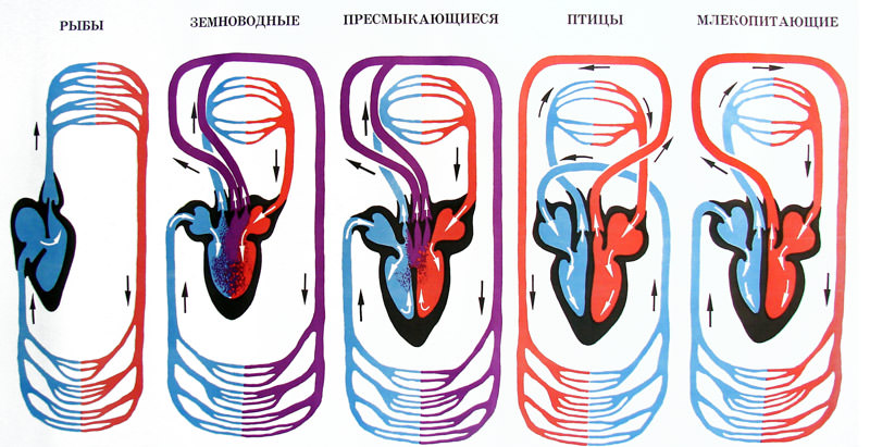 В связи с тем, что по мере эволюции животные класса позвоночных становились все более прогрессивными в анатомо-физиологическом отношении, им требовалось сложное устройство и сердечно-сосудистой системы. Так, для более быстрого движения жидкой внутренней среды в организме позвоночного животного появилась необходимость замкнутой системы циркуляции крови. По сравнению с иными классами животного царства (например, с членистоногими или с червями), у хордовых появляются зачатки замкнутой сосудистой системы. И если у ланцетника, к примеру, отсутствует сердце, но существует брюшная и спинная аорта, то у рыб, амфибий (земноводных), рептилий (пресмыкающихся) появляется двух- и трехкамерное сердце соответственно, а у птиц и млекопитающих – четырехкамерное сердце, особенностью которого является средоточие в нем двух кругов кровообращения, не смешивающихся между собой.